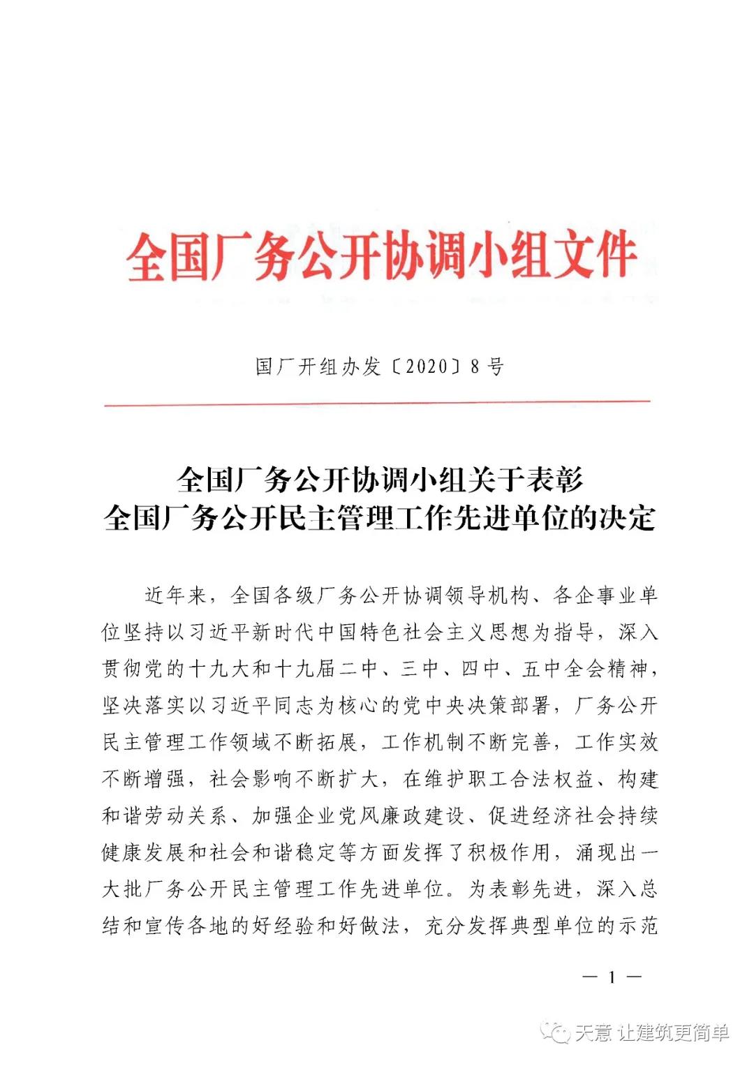 喜訊丨祝賀天意機(jī)械被授予“全國(guó)廠務(wù)公開(kāi)民主管理先進(jìn)單位”稱(chēng)號(hào)