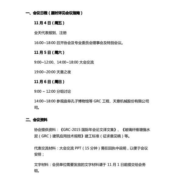 2014 年南京年會(huì)以來的新技術(shù)、新材料和新裝備成果;展示上海迪士尼GRC 典型示范工程風(fēng)采;研討 GRC 技術(shù)與產(chǎn)品研發(fā)方向;匯報(bào) 2015 年迪拜國際 GRC 年會(huì)及國際 GRC 發(fā)展方向;介紹《玻璃纖維增強(qiáng)水泥(GRC)建筑應(yīng)用技術(shù)規(guī)程》建工標(biāo)準(zhǔn)制定情況;觀摩曲阜孔子博物館等 GRC 工程。為滿足與會(huì)者的要求,大會(huì)還將特邀相關(guān)部門專家作裝配式建筑發(fā)展導(dǎo)向性報(bào)告。